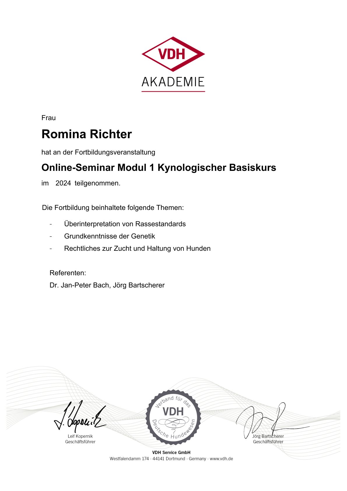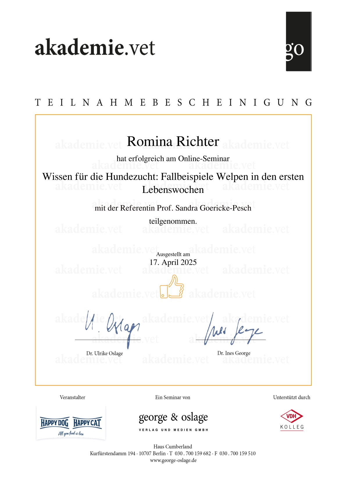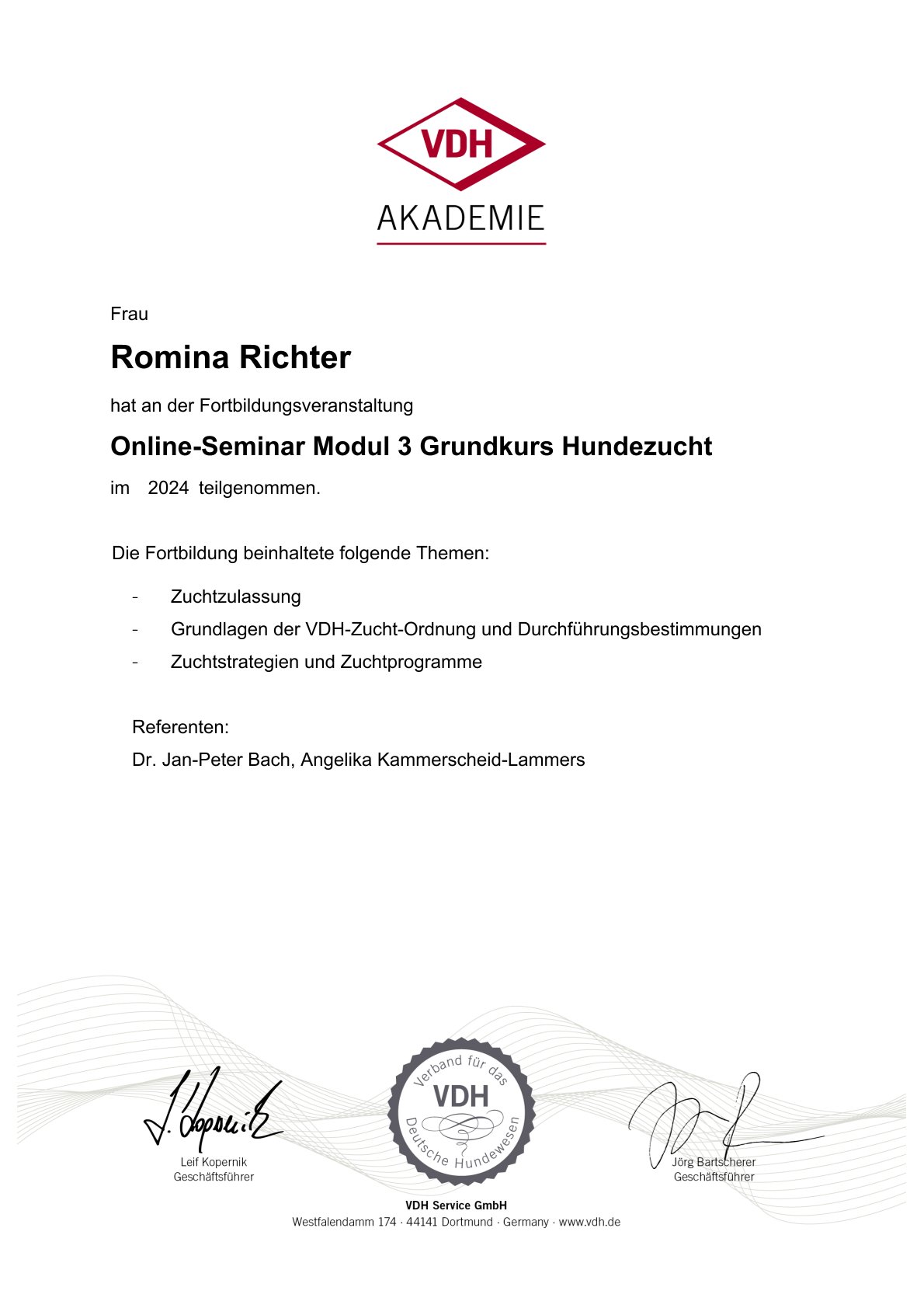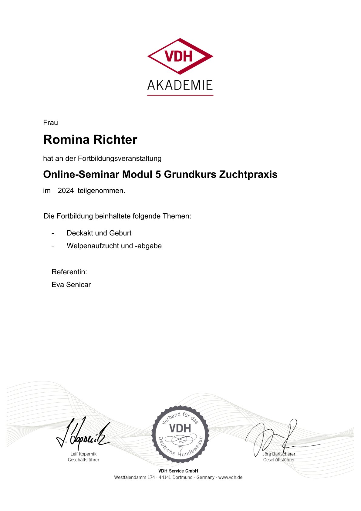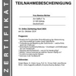 Zertifikate Eine kleine Übersicht über meine aktuellen Zertfizierungen: Hilfe! Die Hündin bleibt leer Wissenswertes zum Caninen Herpes Virus Gesunde Zuchttiere Alles, rund um die Geburt Welpen in den ersten Wochen – akademie.vet 1. Hilfe beim Hund – akademie.vet Grundkurs Zuchtpraxis – VDH Grundkurs Hundezucht – VDH Kynologischer Basiskurs – VDH Zyklusstörungen – akademie.vet 10. Züchtertag – Laboklin Vertragsrecht – Laboklin Geburt und Erstversorgung – Laboklin